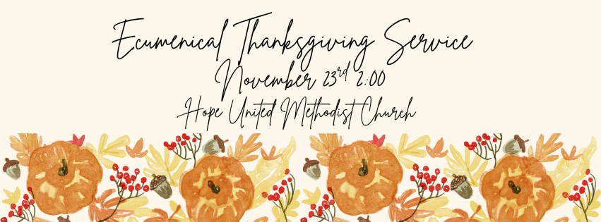 There will be an Ecumenical Thanksgiving Service at Hope United Methodist Church on November 23rd at 2:00 p.m. with all the Belchertown churches participating. Tom Stockton of St. Barnabas Anglican Church will be preaching, and Julie Jonassen of Hope United Methodist Church will be conducting the ecumenical choir and playing the organ. If you want to be part of the ecumenical choir, please come to Hope United Methodist Church at 1:00 p.m. Let us gather as a community to give thanks to God.
